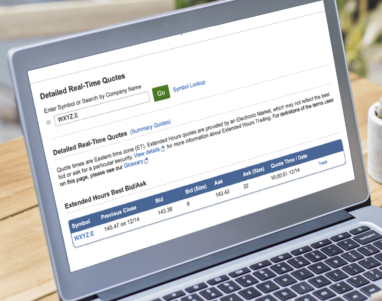 It's important to note that an extended hours quote is different from a regular market quote. One significant difference is that there is currently no accurate trade volume available for extended hours trading on Schwab.com. Extended hours quotes reflect the best bid and ask orders currently available.