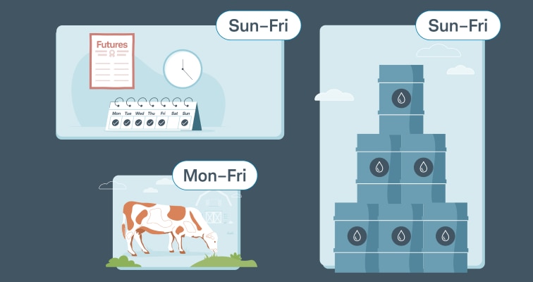 For example, you can trade E-mini S&P 500 futures between 6:00 p.m. ET and 5:00 p.m. ET, while corn futures can be traded from 8:00 p.m. ET through 2:20 p.m. ET with a 45-minute pause from 8:45 a.m. ET to 9:30 a.m. ET.