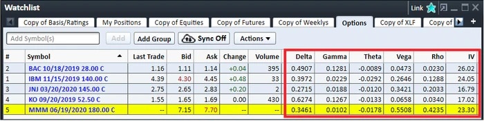 StreetSmart Edge allows you to view streaming Greeks in the options chain of the trading window and in your watch lists. Here is what it looks like.