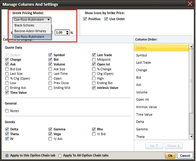 You can arrange the columns to display in any order you like. And, as shown below, you can choose between three of the most widely used pricing models. In addition, the dividend yield and 90-day T-bill interest rate are already filled in. You can use these values or specify your own.