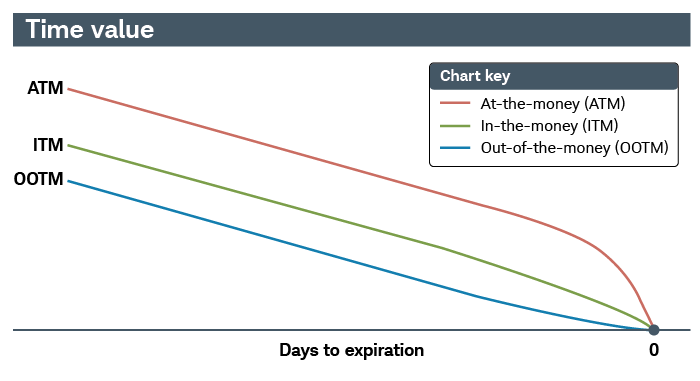 Time-value erosion is not linear, meaning the price erosion of at-the-money (ATM), just slightly out-of-the-money, and ITM options generally increases as expiration approaches, while that of far out-of-the-money (OOTM) options generally decreases as expiration approaches.