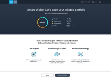 Many investors are overwhelmed by the choices they face as they begin thinking about investing. Schwab Intelligent Income uses low-cost ETFs to build a portfolio that is based on your risk profile. Your portfolio is diversified, with up to 20 asset classes across stocks, bonds, commodities, and cash; is rebalanced automatically; and offers tax-loss harvesting for taxable accounts of at least $50,000. - Distribute: How can I get the money when I need it?