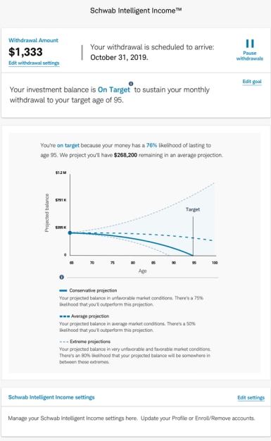 Based on your answers to these questions and other information you provide, Schwab Intelligent Income will calculate and suggest a personalized monthly withdrawal amount. Schwab Intelligent Income runs simulations to project, with varying probabilities, how your portfolio might perform under various market conditions.