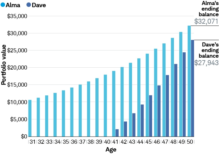 Alma invests $10,000 when she’s 31 and lets the money grow for 20 years. Dave invests $2,000 a year on the same day each year, starting at age 41, for only 10 years. By the time they both reach age 50, Alma has nearly 15% more than Dave even though she invested half as much. Alma has an ending balance of $32,071 compared to Dave’s balance of $27,943.