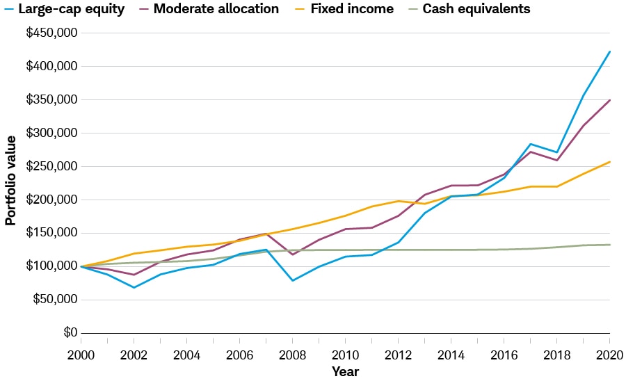 The indexes used are: S&P 500® Index (large-cap equity), Russell 2000® Index (small-cap equity), MSCI EAFE Net of Taxes (international equity), Bloomberg Barclays U.S. Aggregate Bond Index (fixed income), Citigroup 3-Month U.S. T-Bills (cash equivalents). The Moderate Allocation is 35% large-cap equity, 10% small-cap equity, 15% international equity, 35% fixed income, and 5% cash, using the indexes noted. Past performance is no guarantee of future results. The example is hypothetical and provided for illustrative purposes only. It is not intended to represent a specific investment product. Dividends and interest are assumed to have been reinvested, and the example does not reflect the effects of taxes or fees. Indexes are unmanaged, do not incur management fees, costs and expenses, and cannot be invested in directly.