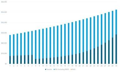 For the first year, Schwab's tax-smart proportional withdrawal strategy automatically withdraws $7,636 from the taxable brokerage account and another $20,364 from the traditional IRA totaling $28,000 of withdrawals from their retirement savings. Nothing is withdrawn from the Roth IRA, allowing it to keep growing. In fact, assuming average market returns, no withdrawals would be required from the Roth IRA to meet spending needs over the full 30-year period. Figure 1 shows the withdrawals from each account over the 30-year period.3