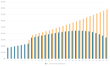 Figure 2 shows the hypothetical results of the proportional withdrawal strategy of Intelligent Income vs. a conventional approach over the full 30-year period. As the chart shows, the estimated annual taxes grow each year with a conventional withdrawal strategy as a result of having a larger percentage of retirement savings held in a traditional IRA (leading to higher RMDs). By contrast, in Schwab Intelligent Income's proportional withdrawal strategy the estimated annual taxes start earlier in the withdrawal period, but grow at a slower pace and eventually decline in the later years. The result is cumulative estimated taxes over the 30-year withdrawal period of $132,490 for the conventional strategy vs. $106,769 for the tax-smart withdrawal strategy of Schwab Intelligent Income. That represents $25,722 less in estimated taxes in this hypothetical example, helping the retiree keep more money that can be used to enjoy retirement.4