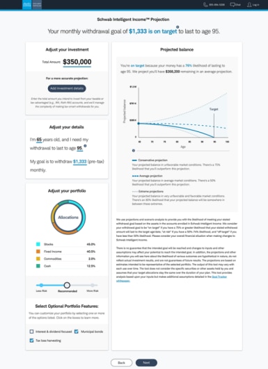 Based on your answers to these questions and other information you provide, Schwab Intelligent Income will calculate and suggest a personalized monthly withdrawal amount. Schwab Intelligent Income runs simulations to project, with varying probabilities, how your portfolio might perform under various market conditions.