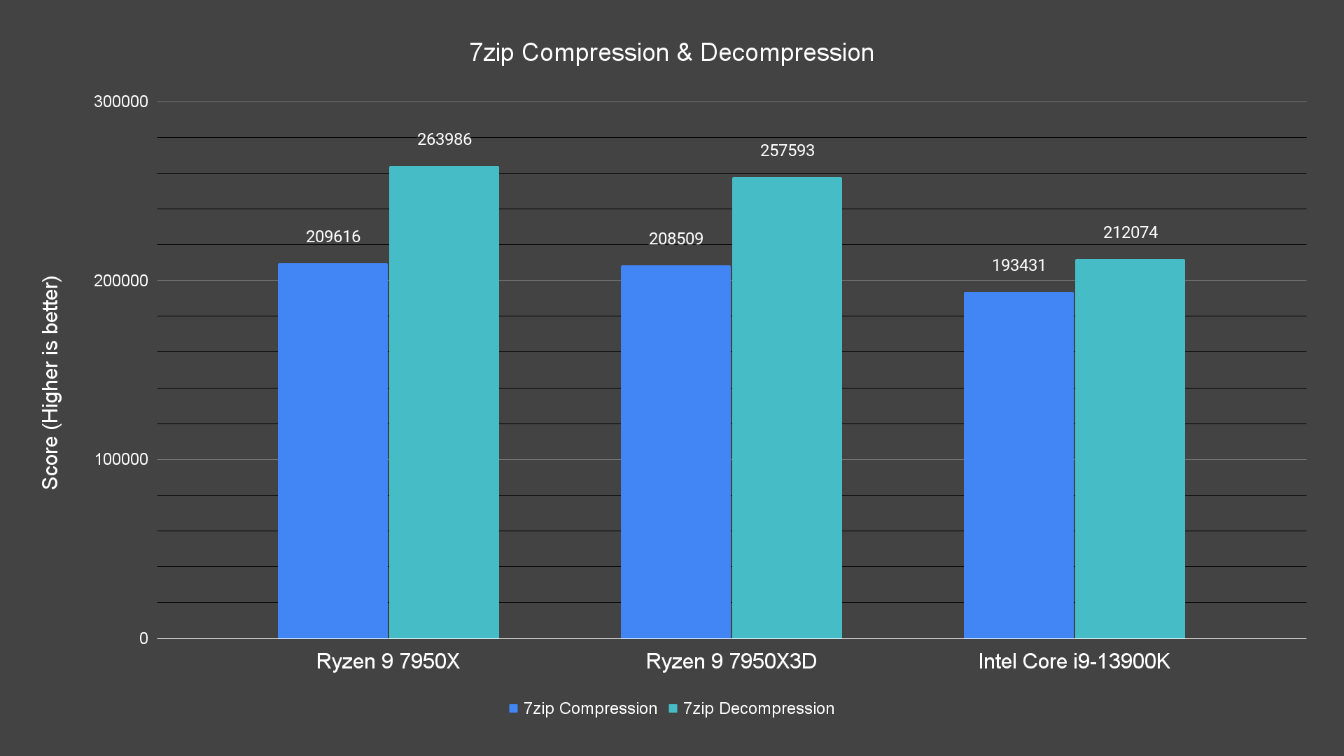 Starting off with the CPU synthetic benchmarks, for the data decompression test with 7zip, the 7950X takes the lead at about 2% faster than the 7950X3D, and 24% faster than the 13900K in data decompression. The 7950X3D is not too far behind and is still 21% than the 13900K.