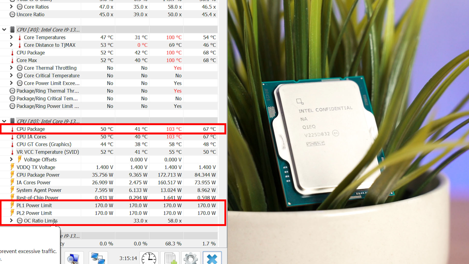 What we had to do is to set the power limit PL1 to 130W and PL2 to 170W and that did help in some ways. It will still hit 100°C on heavy load but it did affect the benchmarks in a few ways – both positively and negatively. We’ll come back to this later.