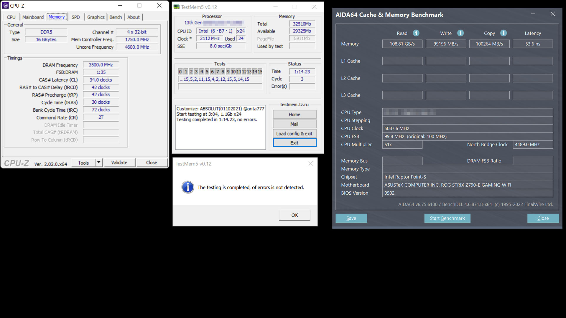 Okay, what about overclocking then? First of all, our CPU cooler can’t handle it, so what Mr Dugi did is to overclock the memory instead. Though this is an engineering sample chip – ES for short, it still runs DDR5 at 7000MHz easily with our existing Hynix M die memory kits. Much easier than 12th Gen, by the way.