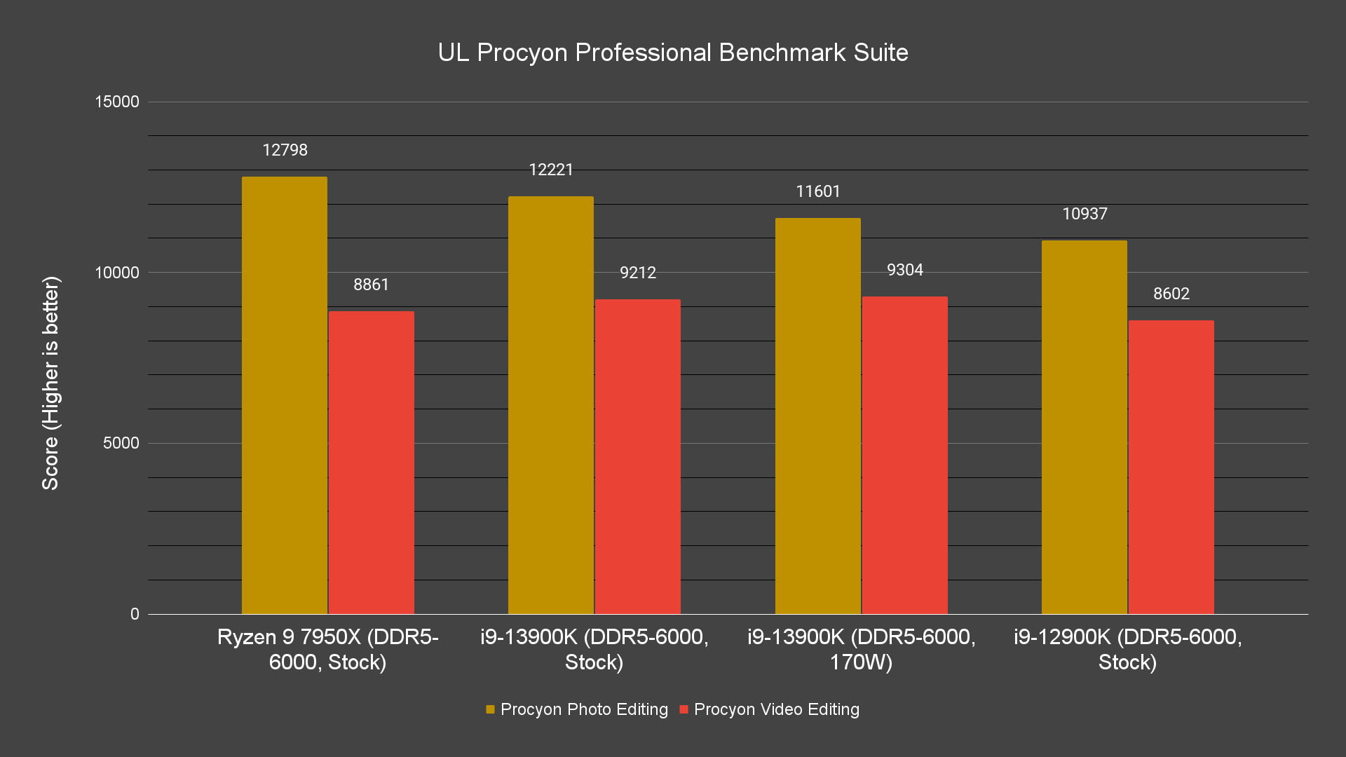 Revisiting some of the graphs that we’ve seen, the Core i9-13900K manages to outperform the Ryzen 9 7950X with a noticeable benchmark score difference except for a few benchmarks, like Wprime and UL Procyon photo editing test.