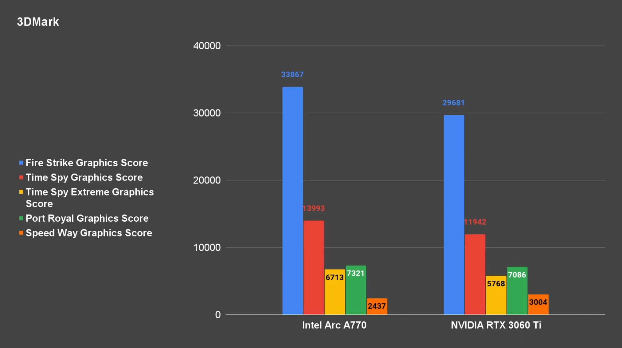 Regarding gaming, although many creators cover this aspect, our quick synthetic benchmark shows Intel Arc A770 outperforming in most tests except for Speedway. Interestingly, it performed better in the Port Royal benchmark, which relies heavily on ray tracing.