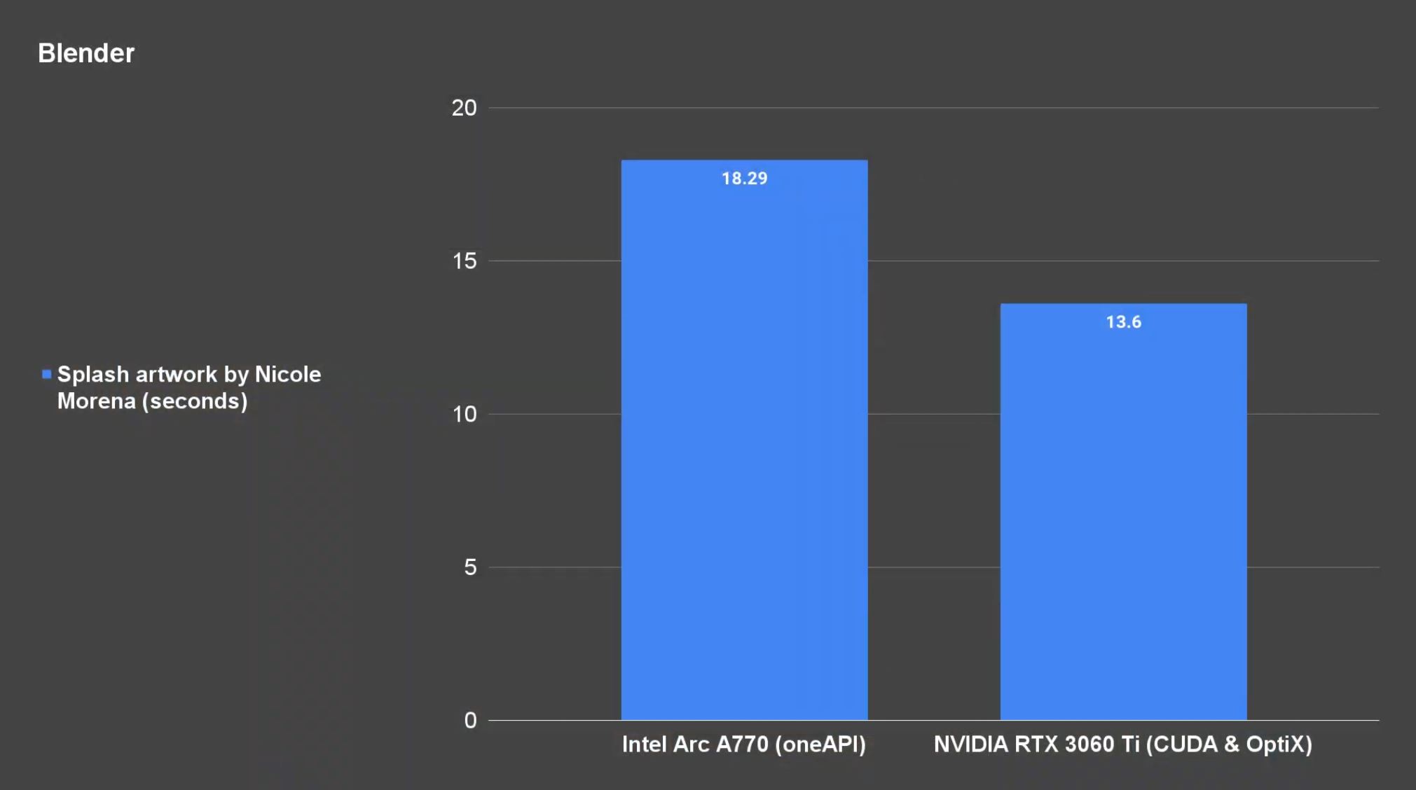 So, let’s start this off with some benchmark numbers on the creative work tasks. In the Blender test using splash art by Nicole Morena, the Intel Arc A770 with its OneAPI takes about 18 seconds to render the image, while the Nvidia card, using CUDA and OptiX, takes only 13 seconds.