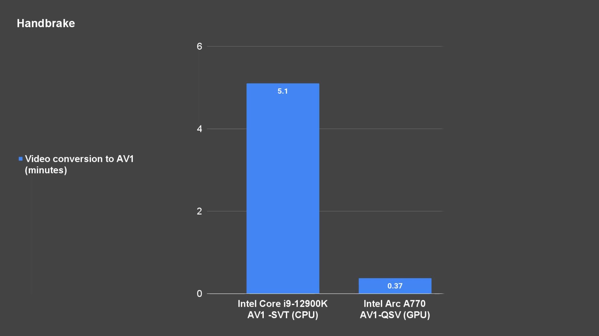 So, is the Intel Arc A770 good? From a creator’s perspective, using it for Premiere Pro, Photoshop, OBS, and Handbrake, it’s not fully advantageous yet unless converting footage to AV1 becomes standard. For streamers, AV1 support can improve streaming quality without increasing upload speed, making it a valuable feature.