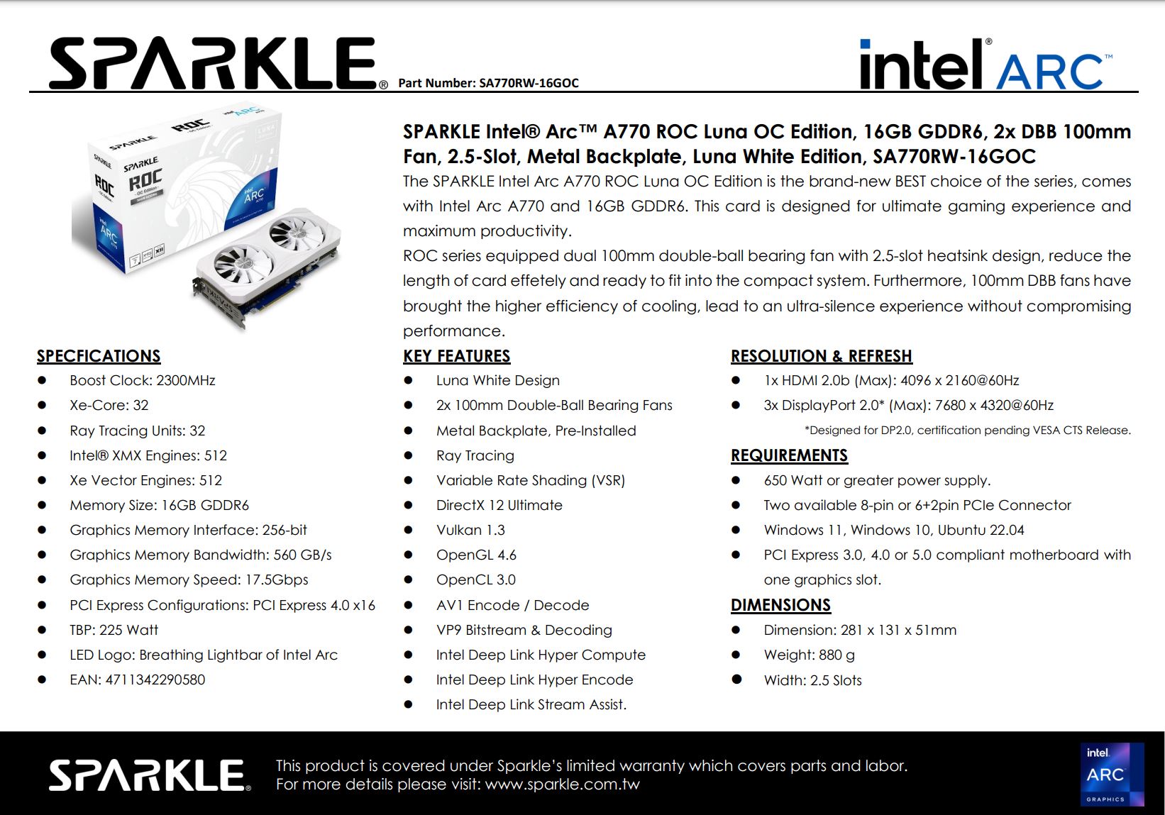 | Graphics Card | SPARKLE Intel Arc A770 ROC LUNA OC Edition |