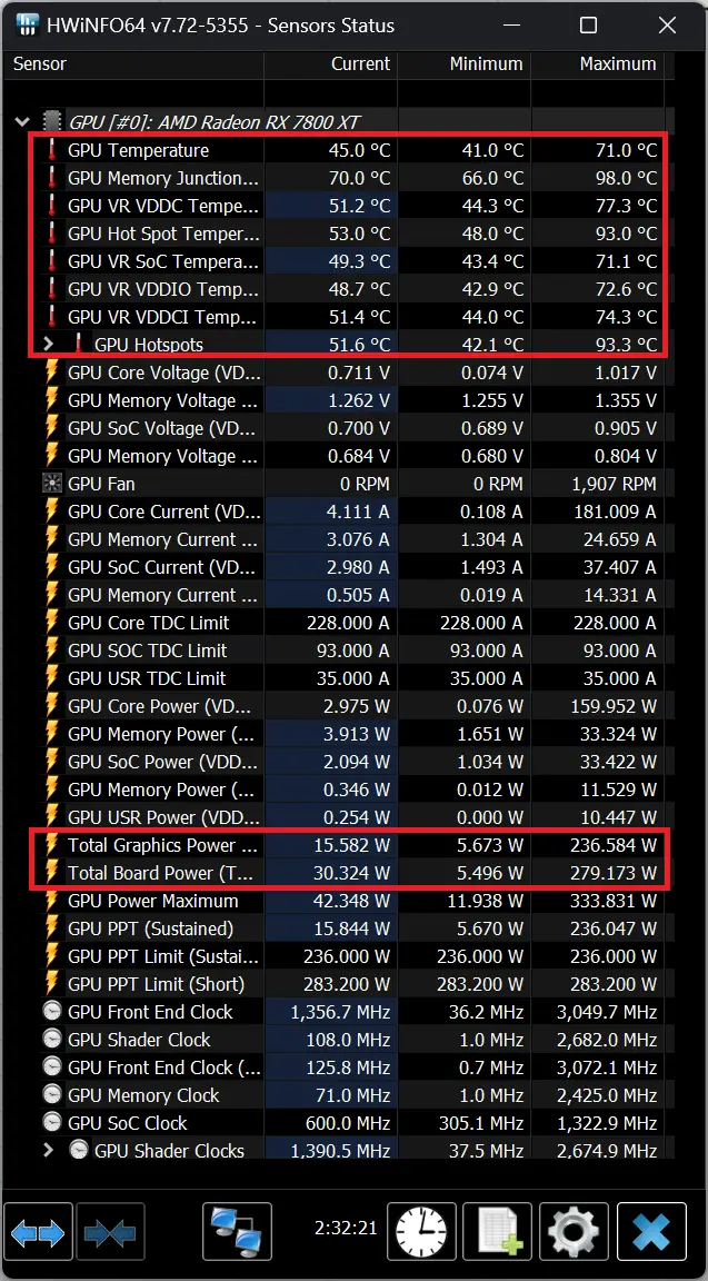 Our testing revealed a 71°C peak temperature for the GPU core under load, which falls within AMD’s specified safe operating range. However, the memory junction and hotspots reached higher temperatures, peaking at 98°C and 93°C respectively. While these numbers might raise concerns, it’s important to note that AMD considers them to be within acceptable limits.