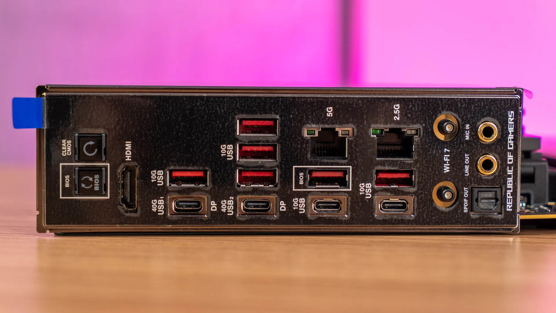 The rear I/O on the X870E Hero delivers exactly what you’d expect from an enthusiast-grade motherboard. You’ll find essential features like the BIOS Flashback and Clear CMOS buttons, invaluable tools for users who frequently tweak their BIOS settings for optimal performance.