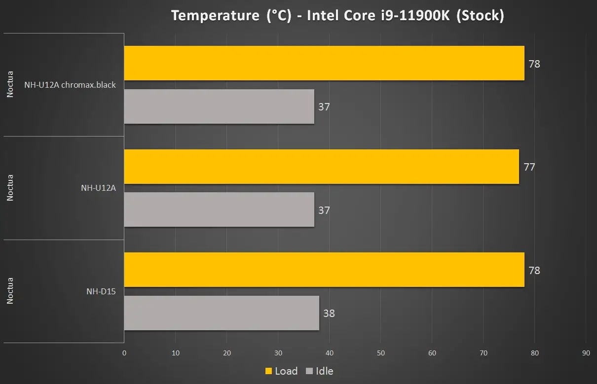 Based on the test results, we can see that all three coolers perform similarly with a recorded load temperature that peaked at 77-78°C. In this case, the NH-U12A is doing slightly better than both the NH-D15 and NH-U12A chromax.black by only 1°C.