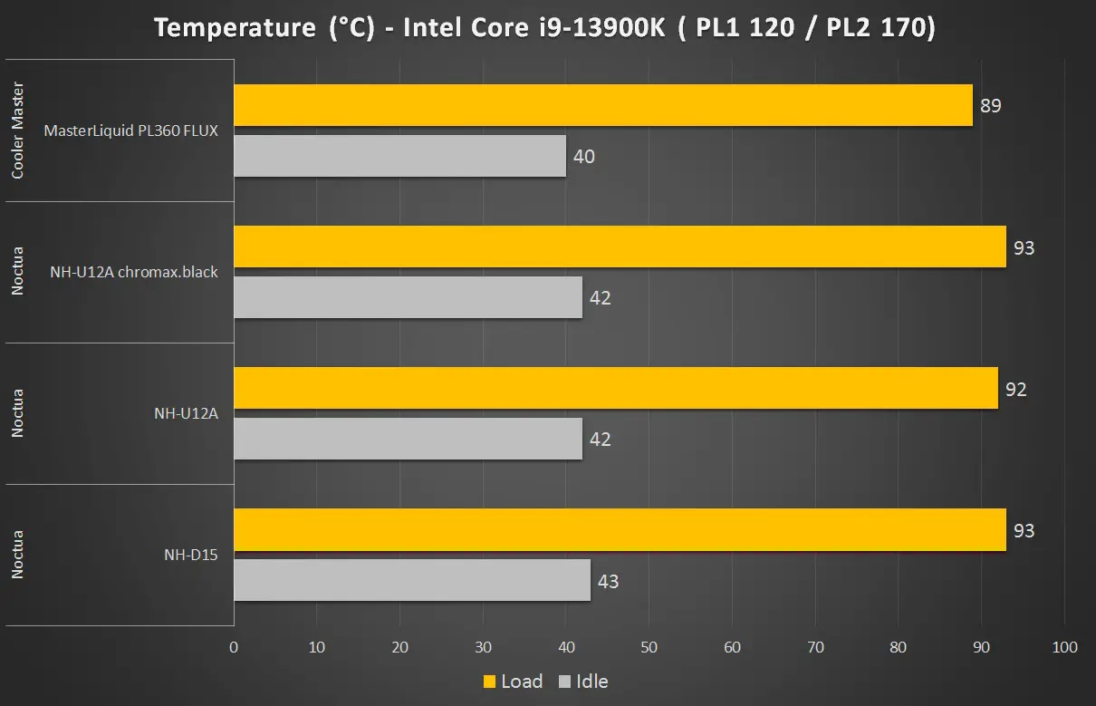 Here we can see that the results are very similar to the i9-11900K test and the NH-U12A still does slightly better than both the NH-D15 and NH-U12A chromax.black by only 1°C. We also compared the results with the MasterLiquid PL360 Flux from Cooler Master, one of the best-performing AIO coolers we have on hand as a quick gauge – these numbers are looking good for an air cooler I must say.