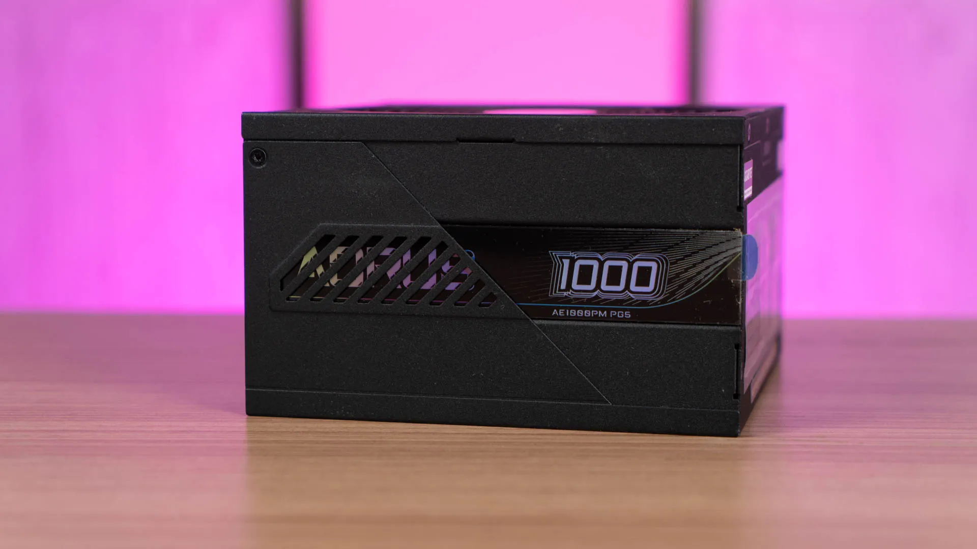 At the side of the power supply, we can see the AORUS magnetic plate offers a unique feature by allowing users to attach it to various sides of the power supply according to their preference, ensuring an optimal visual effect from any angle. As the plate is adjusted within the case, its neon-colored printing and metallic sheen produce striking solid and hollow effects for the AORUS logo, adding a dynamic touch to your build.