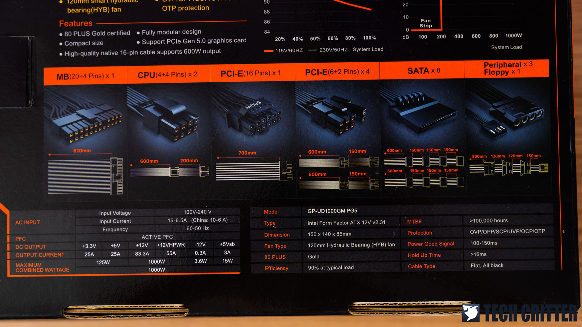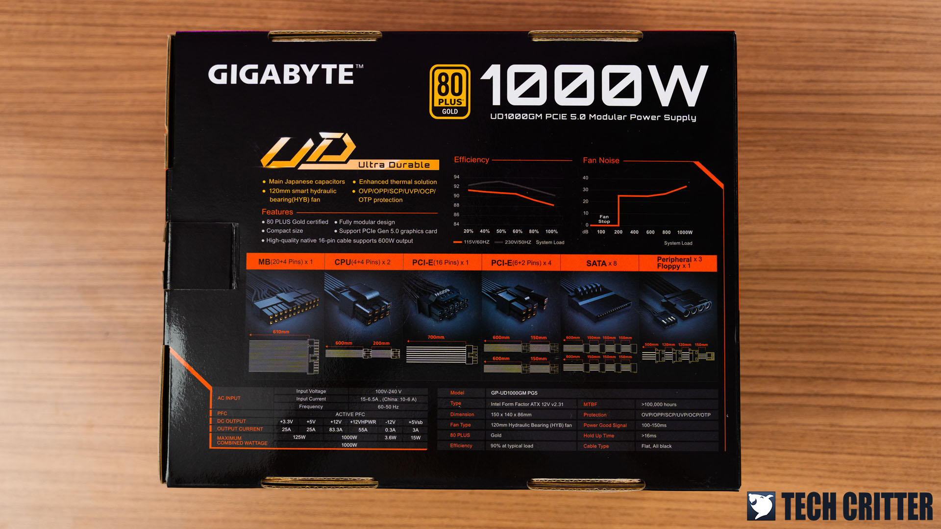 As the UD1000GM is currently the only model in the series that is ready for PCIe 5.0 graphics cards, Gigabyte has specifically highlighted the PCIe Gen5 compliant for this model at the front of the box. The cables, connectors, and specifications can be found at the back of the box if you want to know more information on the product before making your purchase.