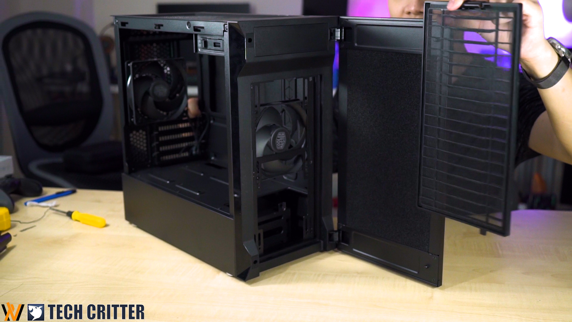 Starting from the front, it has a sleek black look. That front panel is actually a hinged panel, revealing the removable front fan filter and surprisingly, an ODD bay. This hinged panel opens up on the left and swivels to the right by default, but you can flip it around through some screws.