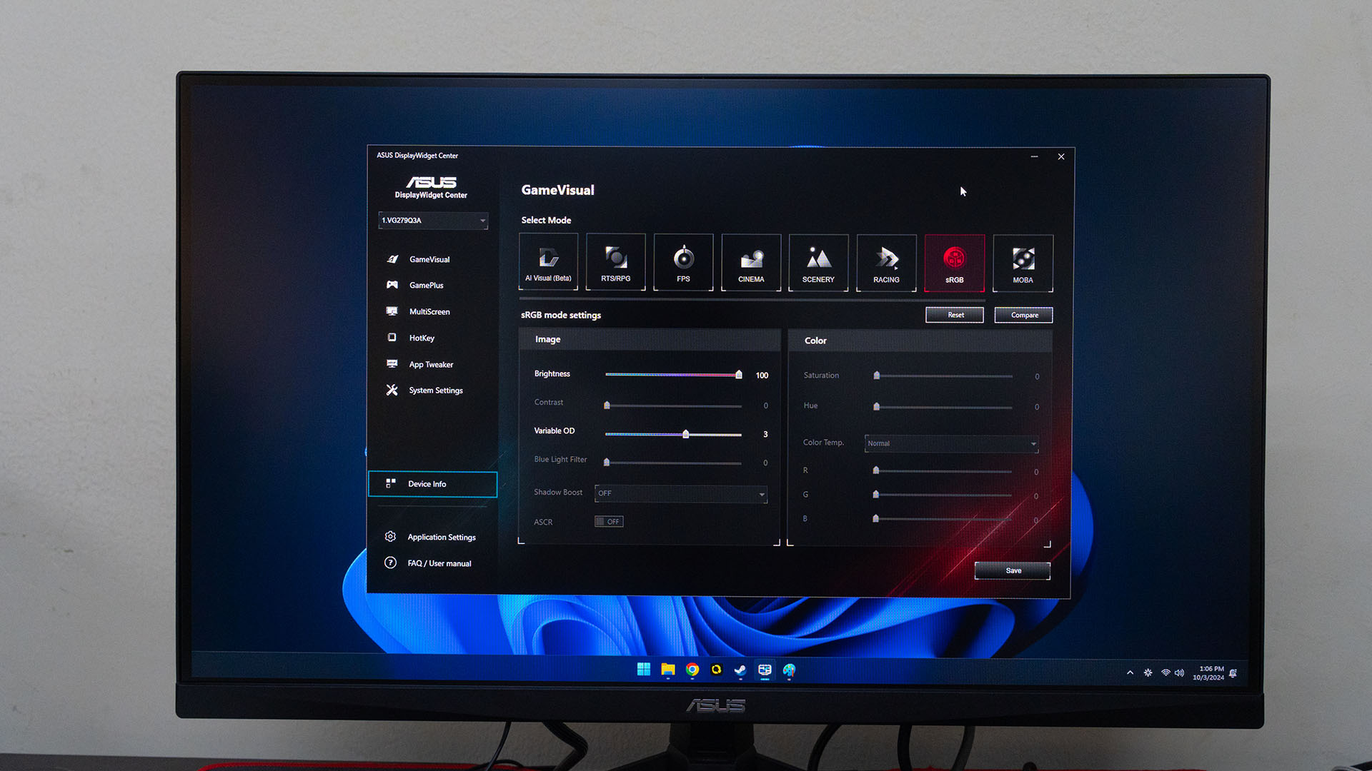 If you want an easier way to change the monitor’s settings, then we can use the ASUS DisplayWidget Center utility for Windows 11. It’s much easier to navigate and also offers a few more features – like adding specific apps to use specific color modes.