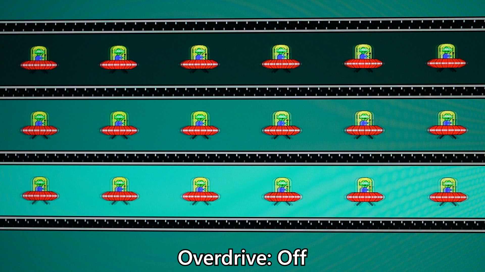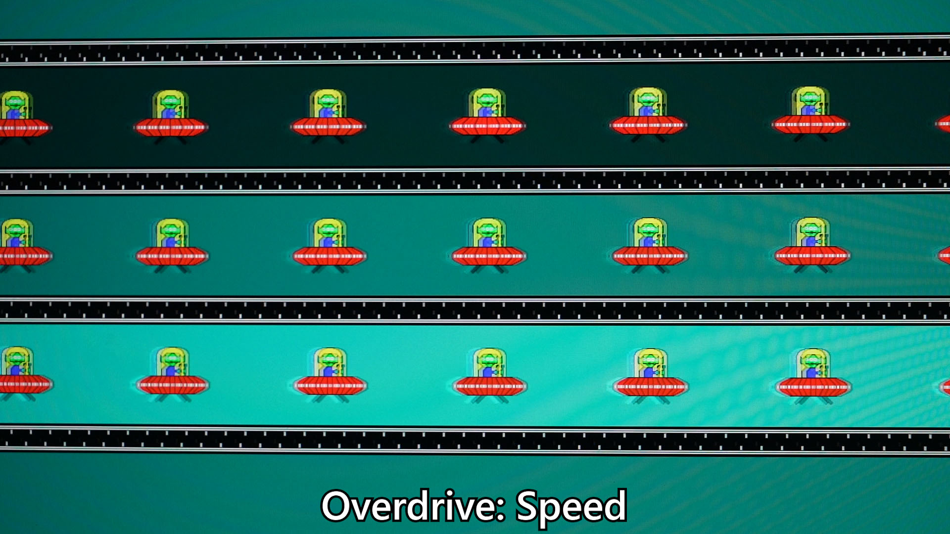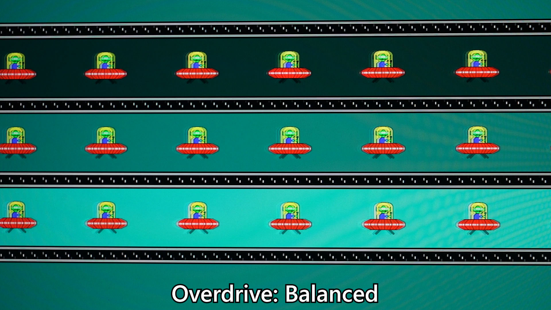 Secondly, the Overdrive option. It’s meant to cut the pixel response time and I can safely say that it does make a difference. If we turn it off, we can see a trail behind the UFO. If we turn it to Balanced or Speed (which is the maximum) then it will overcompensate and also leaves a trail.
