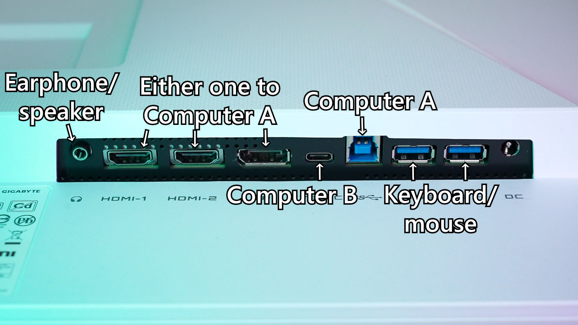 If we plug in all the cables as shown in this diagram here, we can use the KVM feature that is built into the monitor. And that is exactly what we’ve done on this setup here. I can start working on the laptop and when I’m done, just change the settings on the OSD menu and all of a sudden, the same keyboard, video, mouse, and even audio will change to the desktop – and I can use the exact same setup for gaming. That’s the beauty of KVM.