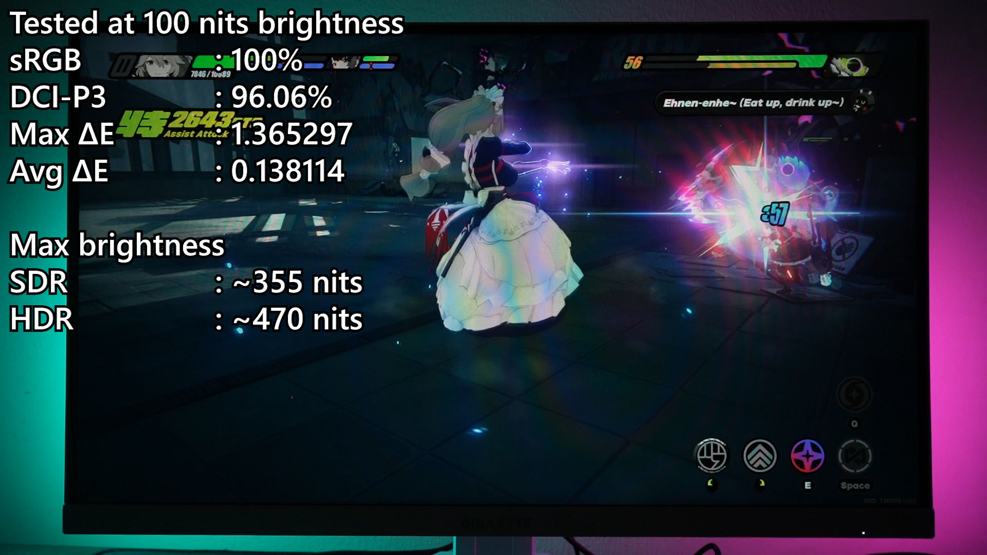 The screen quality is actually quite okay. We can get around 100% of sRGB and 96.06% of DCI-P3 color gamut coverage with a very low delta E number. That’s great in terms of the color reproduction. As for the brightness, this monitor can achieve a maximum of 355 nits in SDR mode and around 470 nits in HDR mode. Impressive so far.