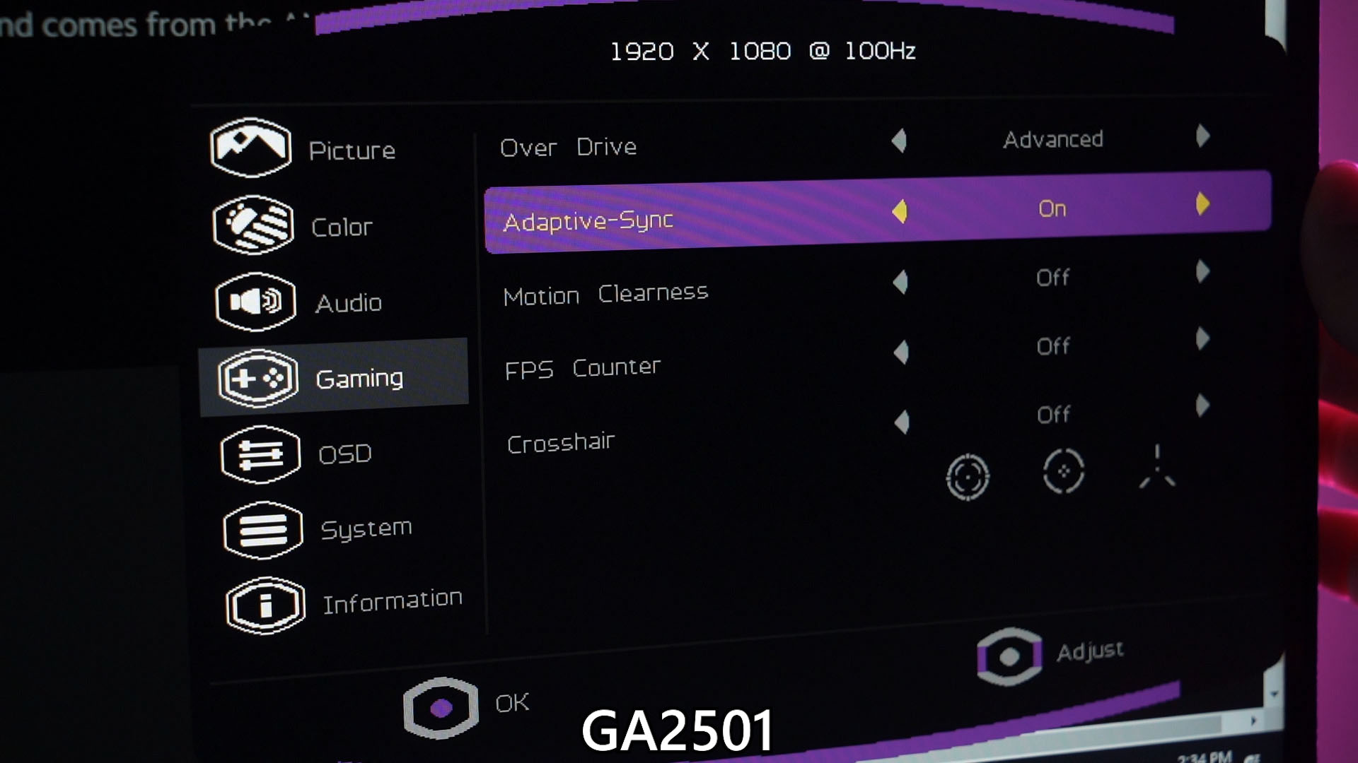 As for the GA2501, it is using a much better panel. It covers 96.5% of sRGB and has a maximum brightness of around 300 nits – which is higher than the smaller GA22FC.