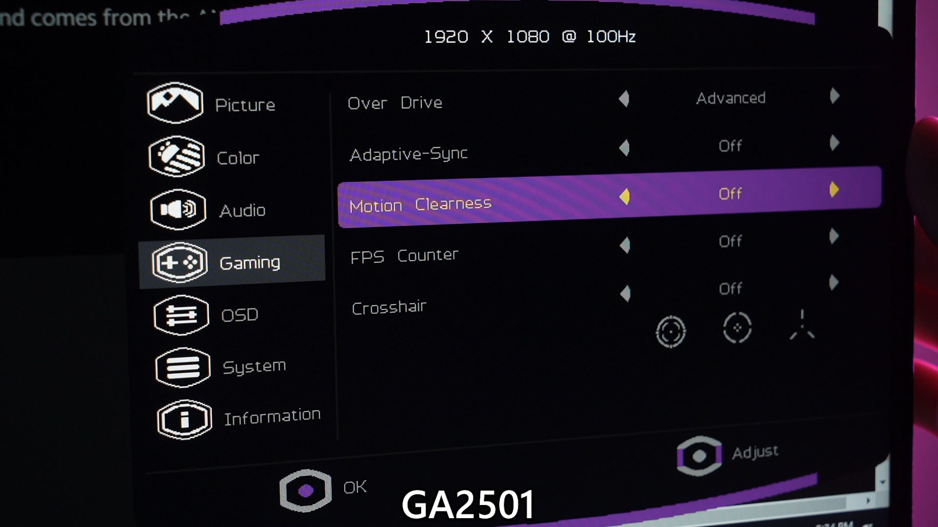 There are a lot of other settings in the OSD menu – and this one features that I want to highlight is Motion Clearness. As the name implies, it does make the motion of fast-moving objects look clearer on the screen. I can’t find much details about it but it seems like the monitor will do black frame insertion to mimic backlight strobing and reduce motion blur, but at the expense of maximum brightness. We’re only getting half of the max brightness, by the way.