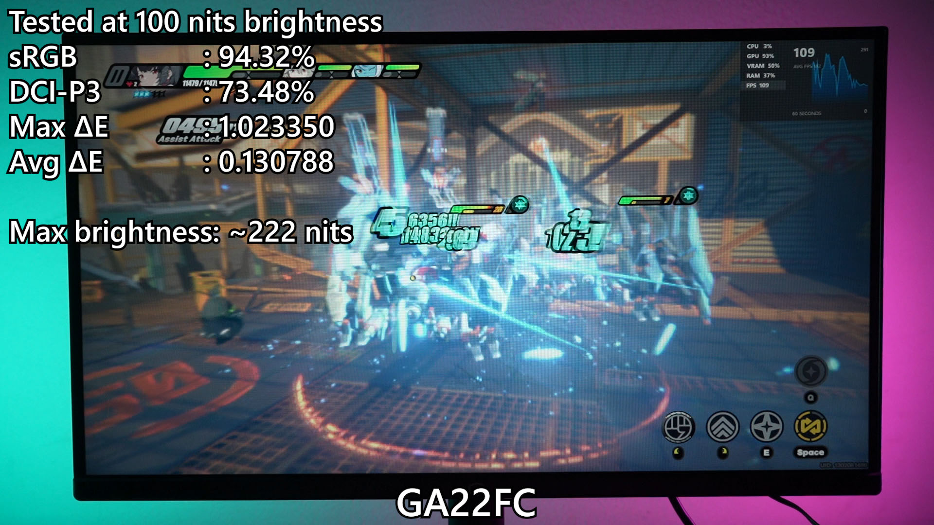 For the GA22FC, our colorimeter reports that this monitor covers around 95% of sRGB color gamut and has a very low ΔE number. The maximum achievable brightness is also not bad – we’re getting around 222 nits as well.