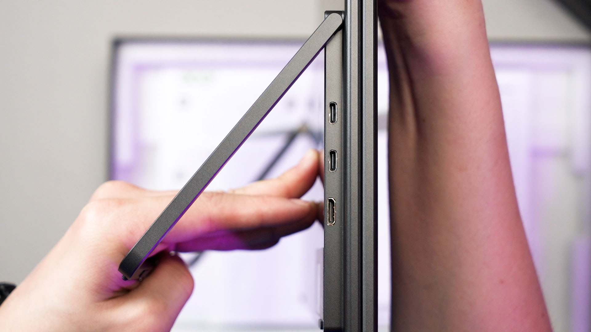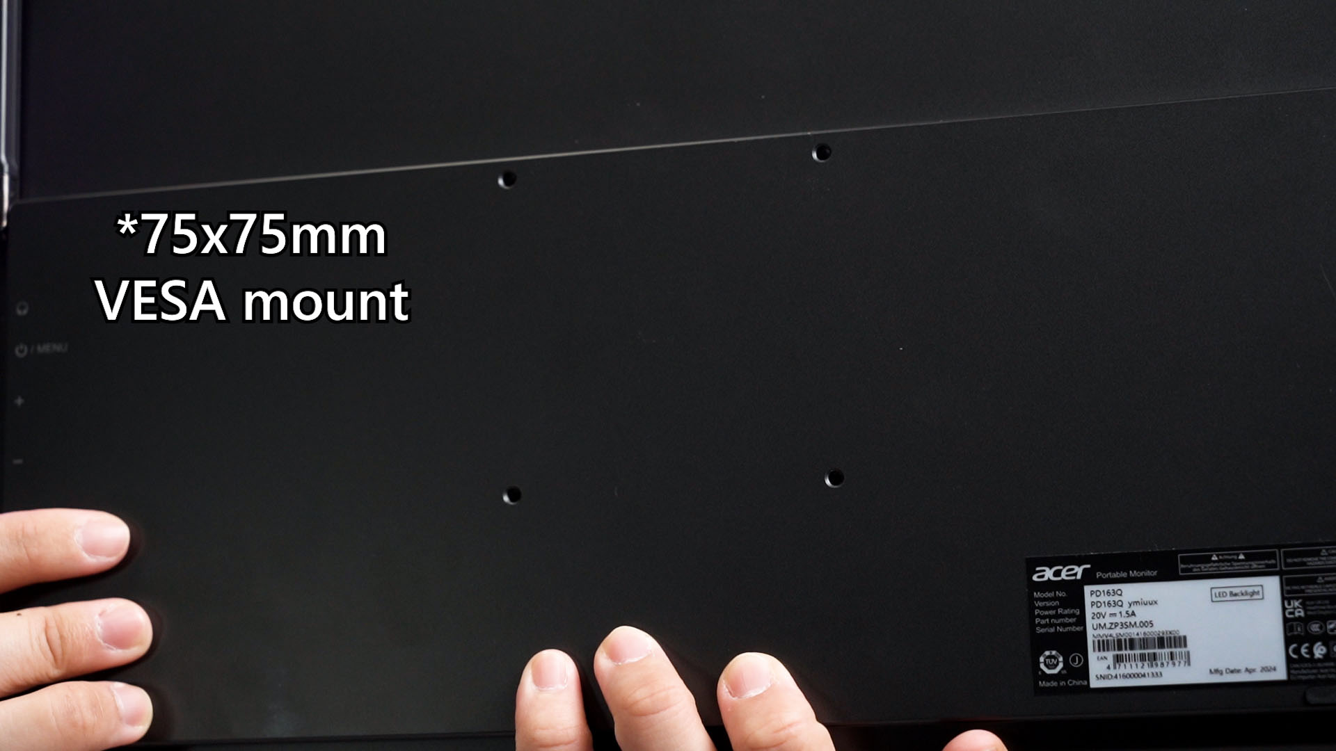 Now, the monitor itself looks like a laptop. At the back, we have a 72x72mm VESA mount, and also an integrated kickstand that is actually very good and can stand at a very steep angle. The ports are also hidden at the sides, so we’ll have to move the kickstand away to get to the ports. And that’s weird because if we use the VESA mount, then I guess we have to park the kickstand up before screwing it in???