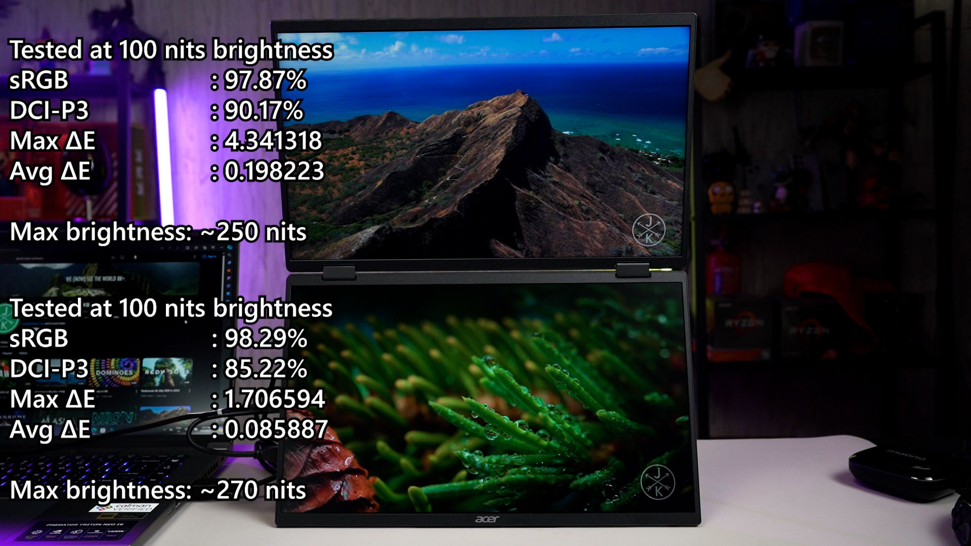 The color accuracy is decent on both monitors, but they do fluctuate quite drastically. Still, the sRGB color gamut coverage and the maximum brightness are consistent between the two monitors. For a portable monitor, this is actually quite good. Most portable monitors that we’ve tested achieved less than this.