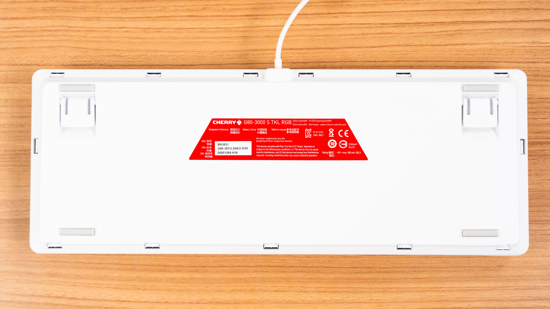 At the bottom of the keyboard, we can see CHERRY’s approach with the rubber fit and kickstand but what really interests me is that the case of the keyboard is secured with a clip design rather than screws. So, taking it apart for cleaning and servicing will require some delicate prying tools so you don’t damage the clips.