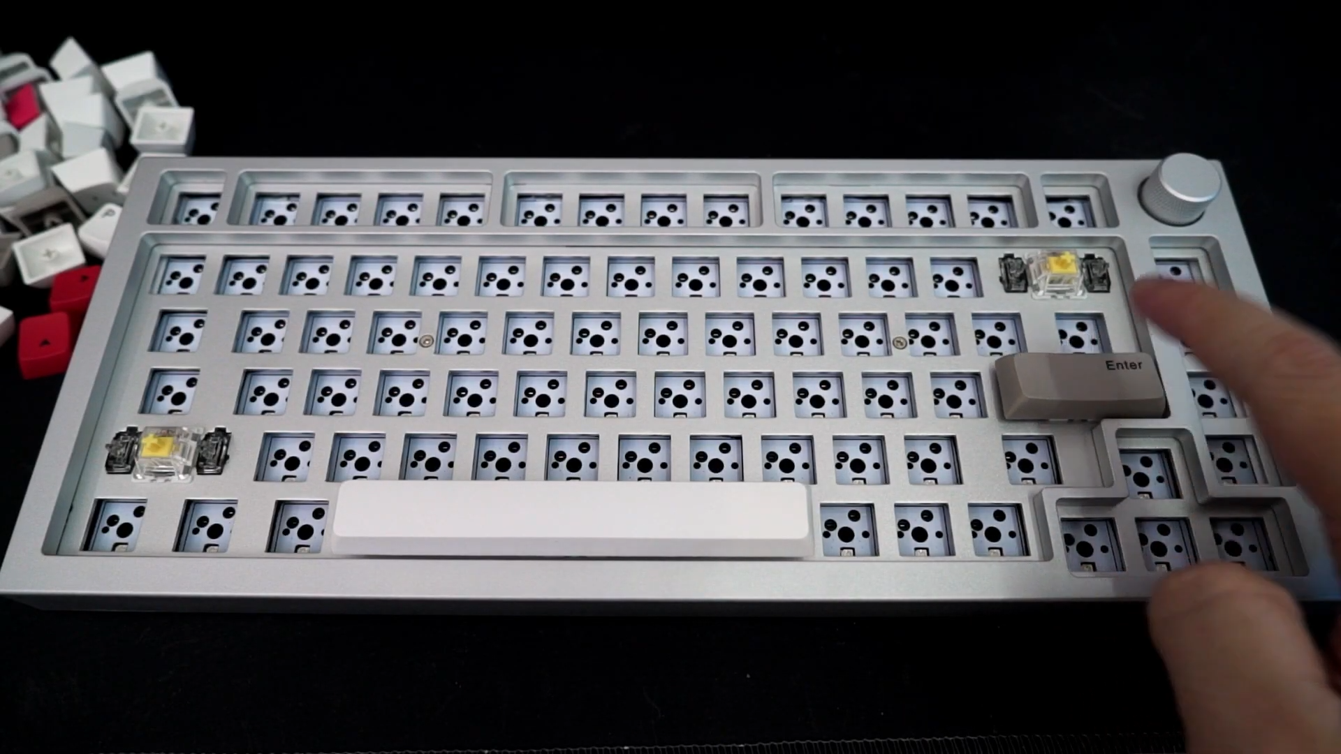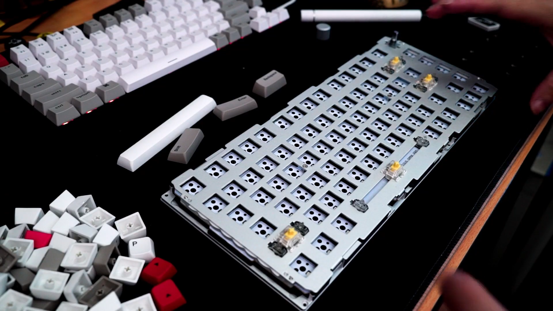 In my build, I’ve gone with stock Gateron Yellow switches and “stole” the keycaps from the 1STPLAYER LANG MK980. You will at least need to modify and tune the stabiliser else it won’t sound any good at all. You can check out our video at the top of this article for the typing sound.