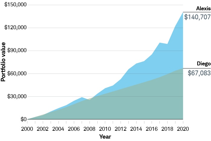 Over that same period, Alexis was planning for her retirement, so she invested $3,000 each year in a moderate portfolio, which returned an average of 6% over 20 years. Alexis had $140,407 after 20 years.
